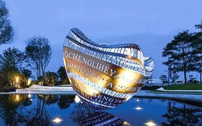 酒店不銹鋼雕塑以美為主,一般為裝飾性美陳景觀雕塑,常見于酒店大門、大堂、園林。包括但不限于水景景觀類,如圓環、噴泉、鏤空球;裝飾美陳類,如蓮花、翅膀、鵝卵石、水滴等。